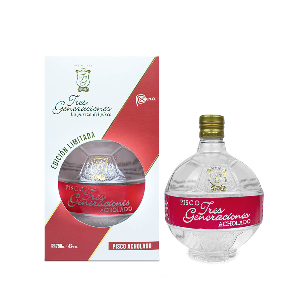 Botella del Hincha Peruano. Una edición única elaborada con pisco acholado, una fusión de cepas aromáticas que combinadas crean un sabor particularmente especial.